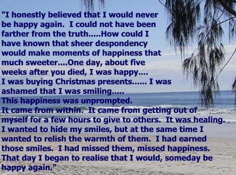 Yes, I am really finishing with happiness. Because it is really possible to feel happiness when you are grieving. I want to quote from Stephanie Ericsson's book “Companion through the Darkness – Inner dialogues on Grief”. Stephanie had lost her husband while pregnant with their only child.