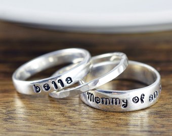Three made to order stackable rings in sterling silver. Customise with your own baby's name and date. Various designs to choose from.